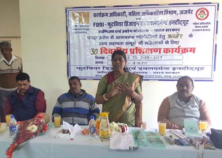 अजमेर 11 फरवरी 2017। कार्यक्रम अधिकारी, महिला अधिकारिता विभाग एवं एफ.डी.डी.आई. फुटवियर डिजाईन एण्ड डवलपमेंट इंस्टीटूयट, वाणिज्य एवं उद्योग मंत्रालय भारत सरकार, चमड़ा उद्योग में आय जनग गतिविधियां हेतु अजमेर के स्वंय सहायता समुह की महिलाओं के लिये 30 दिवसीय प्रशिक्षण कार्यक्रम का शुभारम्भ ओम शांति केन्द्र मलूसर रोड़ नानक का बेड़ा पर प्रारम्भ किया गया।