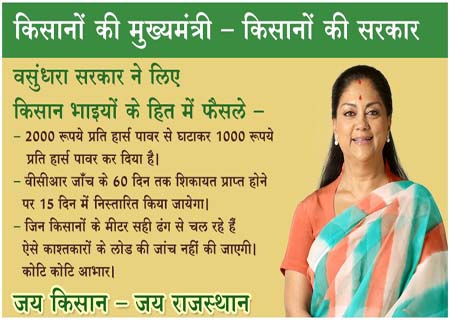 अजमेर, 18 फरवरी। मुख्यमंत्री श्रीमती वसुन्धरा राजे द्वारा कृषि बिजली की दरें घटाने सहित प्रदेश के किसानों को कई सौगातें दी गई हैं। किसानों को अब पूर्ववर्ती दर 90 पैसे प्रति यूनिट की दर से ही बिजली मिलेगी और फ्लैट रेट भी 120 के स्थान पर 85 रुपये प्रति एचपी ही होगी। राजस्थान विद्युत विनियामक आयोग द्वारा कृषि विद्युत कनेक्शन की नई दरों का बढ़ा हुआ भार अब राज्य सरकार वहन करेगी। मुख्यमंत्री ने किसानों को राहत देते हुए और कई घोषणाएं की हैं। अजमेर शहर भाजपा के सभी नेताओं ने मुख्यमंत्री की इन घोषणाओं का स्वागत किया है। उन्होंने कहा कि यह एक क्रान्तिकारी फैसला है। इससे किसानों को बड़े पैमाने पर राहत मिलेगी।