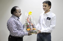 शिशु सर्जन डॉ. महेन्द्र जांगिड को बुके भेंटकर स्वागत करते मित्तल हॉस्पिटल के निदेशक सुनील मित्तल