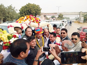 अजमेर/ आज दिनांक 4 जनवरी 2018 शुक्रवार राजस्थान के चिकित्सा एवं स्वास्थ्य मंत्री डॉ रघु शर्मा के अजमेर पहुंचने पर राजस्थान प्रदेश कांग्रेस कमेटी के सदस्य दीपक हासानी के नेतृत्व में भारी संख्या में कांग्रेस कार्यकर्ताओं ने यूनिवर्सिटी तिराहे पर 21किलो की माला पहनाकर जोरदार स्वागत किया! उसके पश्चात रघु शर्मा ने सभी का स्वागत अभिनंदन स्वीकार किया और उसके पश्चात पुष्कर में ना के लिए प्रस्थान किया कार्यक्रम में पीसीसी सदस्य दीपक हासानी, शहर कांग्रेस महामंत्री विपिन बेसिल, प्रवक्ता अंकुर त्यागी,जे पी दाधिच, शिवराज भडाणा, ईश्वर टेहलयानी, पूसा गुर्जर,सुरेश्वर शैली, नयन आनंद, मोहन सोनी, मामराज सेन, हनीश मारोठिया, अनिल कोठारी,विपिन जैन,गिरीश असनानी सहित अनेक संख्या में कांग्रेस कार्यकर्ता मौजूद थे l