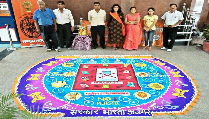 अजमेर, अजमेर रेलवे स्टेशन के मुख्य प्लेटफार्म पर संस्कार भारती अजमेर इकाई द्वारा सिंगल यूज प्लास्टिक से होने वाले दुष्परिणामों के प्रति जन जागृति फैलाने हेतु एक विशाल रंगोली का चित्रांकन किया गया l जिसका उद्घाटन अजमेर मंडल के एडीआरएम आदित्य मंगल ने दीप प्रज्वलन कर किया l
