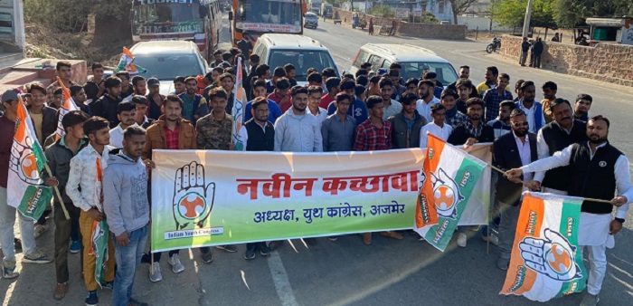 अजमेर । भारतीय जनता पार्टी की केंद्र सरकार की जनविरोधी नीतियों बढ़ती महंगाई एवं बेरोजगारी के विरोध में जयपुर में आयोजित जन विरोधी युवा आक्रोश रैली में युवा कांग्रेस अजमेर शहर के अध्यक्ष नवीन कच्छावा के नेतृत्व में अजमेर से 500 से अधिक युवा कांग्रेस के कार्यकर्ताओं ने भाग लिया।