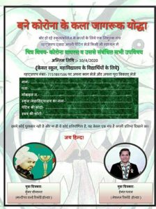 दो मित्रो की जोड़ी सीमान्त ज्योतियाना (मल्टीपर वर्ल्ड रिकॉर्ड होल्डर )व हेमंत धवल (इंडिया बुक ऑफ नेशनल रिकॉर्ड होल्डर )ने बोर हो रहे स्कूली/कॉलेज के विद्यार्थियों के लिये जागरूकता लाने के उद्देश्य से “बने कोरोना के कला जागरूक योद्धा ऑनलाइन ड्राइंग/पैंटिंग निःशुल्क मंच की शुरुआत की है ये कोई प्रतियोगिता नही बल्कि जागरूकता लाने के लिये व विद्यार्थियों की कला को एक उचित प्लेटफार्म देने का एक छोटा सा प्रयास है इस मे विद्यार्थि लगातार कोरोना विषय व इस के सभी उपविषय लॉकडाउन का पालन, सरकारी नियमो का पालन करना ,बार बार हाथ धोना, नमस्कार करना जैसे विषयों पर पेंटिंग बना कर लोगो को जागरूक कर रहे है जानकारी देते हुये हेमंत धवल ने बताया कि ये मंच पूरी तरह ऑनलाइन है व पूरी तरह से निःशुल्क है! इस मंच पर विद्यार्थि 10/4/2020 तक अपनी कृति भेज सकते है!