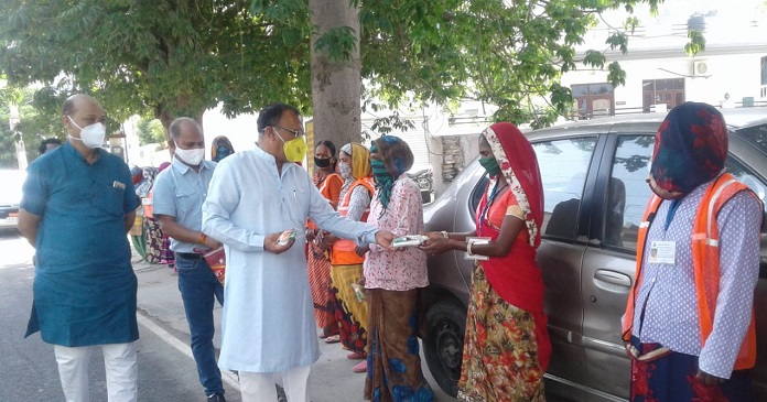 अजमेर, 11 मई। विधायक अजमेर उत्तर वासुदेव देवनानी ने नगर निगम के विभिन्न वार्डो के सफाई कर्मियों तथा पुलिस कर्मियों को कोरोना संक्रमण से बचाव व सुरक्षा के लिए तैयार किये गये परिवार किट वितरित किये । उन्होंने अपनी जान जोखिम में डालकर संक्रमणकाल में काम करने वाले कोरोना कर्मवीर सफाई कर्मचारियों का अभिनन्दन भी किया।