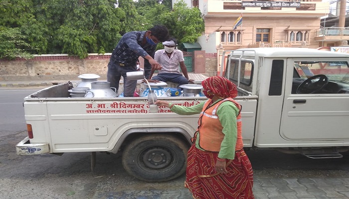 तीर्थक्षेत्र नारेली प्रभारी ब्रह्मचारी भैया सुकान्त जैन द्वारा श्री दिगम्बर जैन महिला महासमिति व लायंस क्लब अजमेर आस्था के संयुक्त तत्वावधान में विगत बाईस दिनों से वैश्विक महामारी कोरोना वायरस के संक्रमण से आमजन की सुरक्षा कर रहे कोरोना वारियर्स के उपयोग हेतु व सम्मान स्वरूप दूध की सेवा पुलिस लाइन के जवानों हेतु व अजमेर शहर को स्वच्छ रखने में अपनी महत्वपूर्ण भूमिका निभा रहे सफाई कर्मियो के लिए एक सौ दस लीटर दूध व कर्फ्यूग्रस्त क्षेत्र सरावगी मोहल्ला में 30 लीटर व 10 लीटर अन्य व्यक्तियों के लिए दूध भेंट करते हुए कहा कि अदृश्य शत्रु को पराजित कर रहे हमारे कोरोना वॉरियर्स ने जन-जन के हृदय में स्थान बना लिया है,उनके सेवाभाव की वजह से ही आज हज़ारों व्यक्ति अपने आप को सुरक्षित महसूस कर रहे है जिसके कारण सभी के हृदय से योद्धाओं के लिए दुआएं निकलती हैं। देश सेवा में समर्पित इन कोरोना वॉरियर्स हमारे देश परिवार के अहम सदस्य हैं। दिगम्बर जैन महासमिति युवामहिला संभाग अध्यक्ष मधु पाटनी ने बताया कि ब्रह्मचारी भईया सुकान्त जैन के द्वारा प्राप्त दूध की प्रशंसनीय सेवा से सभी लाभान्वित हो रहे हैं व लायंस क्लब्स इंटरनेशनल के पूर्व संम्भागीय अध्यक्ष व कार्यक्रम संयोजक लायन अतुल पाटनी के माध्यम से प्रतिदिन पुलिस लाइन पर वारियर्स के उपयोग हेतु दूध की आपूर्ति की जा रही है। लायंस क्लब अजमेर आस्था के अध्यक्ष लायन पदमचंद जैन व युवामहिला संभाग अध्यक्ष मधु पाटनी ने सुकान्त भईया का आभार व्यक्त करते हुए सेवा प्राप्त कर रहे वारियर्स के प्रति धन्यवाद ज्ञापित किया