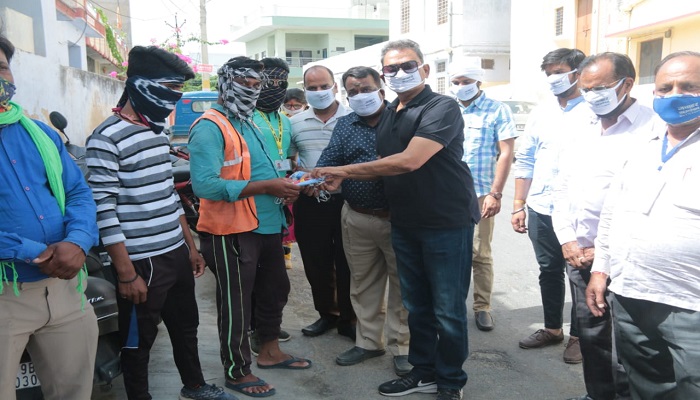 केरोना कर्मवीर यौद्धा सफाई कर्मचारियों पर फूलों की वर्षा कर मास्क साबुन एवं सैनिटाइजर देकर सम्मानित किया गया।