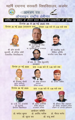 महर्षि दयानंद सरस्वती विश्वविद्यालय अजमेर के कप्तान दुर्गाप्रसाद जर्नलिज्म मास कम्युनिकेशन एंड मल्टीमीडिया टेक्निक विभाग द्वारा तीन दिवसीय (26 मई से 28 मई 2020 तक) ऑनलाइन सेमिनार विषय: कोविड-19 के संकट के दौरान भारत निर्माण में पत्रकारिता की भूमिका आयोजित की जा रही है!