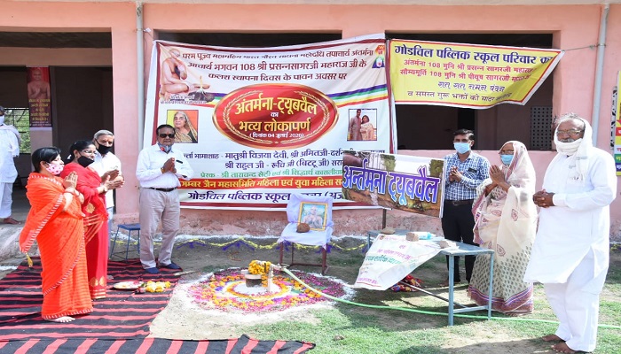 परम् पूज्य महामहिम भारत गौरव साधना तपोदधि तपाचार्य अन्तर्मना आचार्य भगवन 108 श्री प्रसन्न सागर जी महाराज जी के कलश स्थापना दिवस के पावन अवसर पर गोडविल पब्लिक स्कूल नरवर (अजमेर)में अन्तर्मना ट्यूबवैल का भव्य लोकार्पण आज अन्तर्मना गुरुदेव के भक्त श्री प्रेम चन्द पाटनी ,तारा चन्द सेठी ,श्रीमती मधु पाटनी , श्रीमती रेणु पाटनी व श्री आनन्दी लाल शर्मा द्वारा किया गया ।