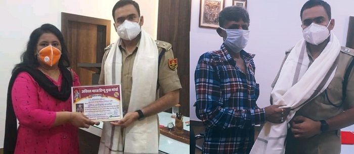 अखिल भारत हिन्दू युवा मोर्चा संगठन शाखा मातृभूमि महिला मोर्चा राजस्थान प्रदेश उपाध्यक्ष श्रीमती पूजा सन्तवानी के नेतृत्व में कोरोना योद्धा अजमेर पुलिस अधीक्षक श्रीमान कुंवर राष्ट्रदीप सिंह जी का शाल माला पहनाकर कोरोना योद्धा सम्मान प्रशंसा पत्र देकर उनका सम्मान किया गया।