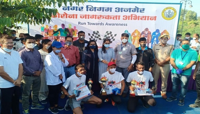 अजमेर, 10 अक्टूबर। कोरोना जागरूकता अभियान के अन्र्तगत शनिवार को नगर निगम द्वारा मैराथन दौड़ का आयोजन किया गया। नगर निगम उपायुक्त श्रीमती देविका तोमर ने बताया कि कोरोना जागरूकता अभियान से यूवाओं को जोड़ने के लिए नगर निगम अजमेर द्वारा 5 किलोमीटर मैराथन रेस का आयोजन किया गया। मैराथन के इस आयोजन में ऑनलाइन रजिस्ट्रेशन द्वारा 123 प्रतिभागियों ने भाग लिया। मैराथन रेस के आयोजन में कोविड-19 से बचाव के लिए मास्क की अनिवार्यता, सैनेटाइजेशन तथा सोशल डिस्टेंसिंग का संदेश दिया गया।