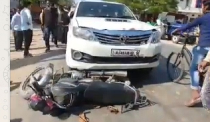 केकड़ी 22 नवंबर (नि सं) अजमेर रोड पर अजमेर की तरफ से आ रही एक फॉर्च्यूनर ने बाइक को जोरदार टक्कर मारी जिससे बाइक पर सवार तीन लोग घायल हो गए।फॉर्च्यूनर ने गलत साइड में आकर टक्कर मारी।यह गाड़ी अजमेर से कोटा की तरफ जा रही थी।घटना स्थल पर भारी भीड़ जमा हो गई थी घायलों को केकड़ी के जिला अस्पताल पंहुचाया गया।केकड़ी पुलिस ने मौके पर पंहुच जांच प्रारम्भ कर दी है।प्रारंभिक जांच में फार्च्यूनर एक विधायक की होना सामने आया है।
