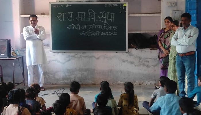 केकड़ी 30 सितंबर(पवन राठी) :राजकीय उच्च माध्यमिक विद्यालय सूंपा में गांधी जयंती 2 अक्टूबर 2022 पर विविध कार्यक्रम आयोजित होंगे कार्यक्रम संयोजक गोपाल लाल वैष्णव ने बताया कि निदेशक महोदय के आदेशानुसार दिनांक 30 -9-2022 को शाला में उपलब्ध संसाधनों वाद्य यंत्रों का उपयोग करते हुए गांधी भजन और सर्व धर्म प्रार्थना कार्यक्रमों का पूर्व अभ्यास करा कर रियाज करवाया गया इसमें शाला के सभी बालक बालिकाओं ने भाग लेकर प्रार्थना भजन का रियाज कियाप्राचार्य श्यामसुंदर पारीक भानाराम सत्यनारायण सुशील नारायण किरणशर्मा कन्हैया लालशंकरलाल राजबहादुर सिंह आराधना प्रियंका चंचल ने सहयोग किया।
