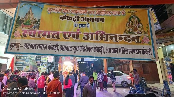 केकड़ी 3 जनवरी(पवन राठी) / *अखिल भारतीय अग्रवाल सम्मेलन की ओर से संपूर्ण भारत वर्ष में हमारी कुलदेवी महालक्ष्मी जी की जन आशीर्वाद यात्रा* केकड़ी में आज निकाली गई जो दीपक गोयल पेट्रोल पंप वालों के यहां से प्रारंभ होकर केकड़ी के मुख्य मार्गो से होती हुई लक्ष्मीनाथ मंदिर पर संपन्न हुई इस रथयात्रा का नगर के कई गणमान्य नागरिकों एवं अगर बंधुओं ने आरती एवं पुष्प वर्षा कर भव्य स्वागत किया लक्ष्मीनाथ मंदिर में महालक्ष्मी जी की महाआरती की गई उसके पश्चात अग्रवाल धर्मशाला देवगांव गेट बाहर एक समारोह का आयोजन किया गया जिसमें बाहर से पधारे अखिल भारतीय अग्रवाल सम्मेलन के पदाधिकारि गिरधारी लाल जी मंगल जिला अध्य्क्ष