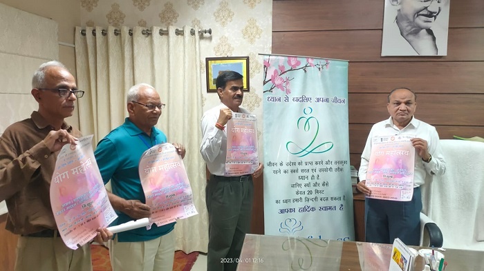 अजमेर एक अप्रेल। आजादी का अमृत महोत्सव के कार्यक्रमों की श्रंखला में संस्कृति मंत्रालय द्वारा श्री रामचन्द्र मिशन हार्टफुलनेस संस्थान के माध्यम से आगामी 7 से 9 अप्रेल को आयोजित होने वाले योग महोत्सव के पोस्टर का शनिवार को सम्भागीय आयुक्त श्री बी.एल. मेहरा के द्वारा विमोचन किया गया। सम्भागीय आयुक्त श्री बी.एल. मेहरा ने बताया कि स्वतंत्रता के 75 वर्ष पूर्ण होने के अवसर पर आजादी का अमृत महोत्सव मनाया जा रहा है। इसके अन्तर्गत प्रत्येक स्तर पर विविध गतिविधियों का आयोजन किया जा रहा है। संस्कृति मंत्रालय द्वारा श्री रामचन्द्र मिशन हार्टफुलनेस संस्थान के सहयोग से पूरे देश में योग महोत्सव को आयोजन किया जा रहा है। राजस्थान में 12 स्थानों का चयन इस कार्य के लिए हुआ है। अजमेर में योग महोत्सव 7 से 9 अप्रेल को होगा। योग महोत्सव के लिए डीआरएम ऑफिस के पास स्थित रेल्वे जीएलओ ग्राउण्ड निर्धारित किया गया है। उन्होने बताया कि शनिवार को सम्भागीय आयुक्त कार्यालय में आयोजन संयोजक सेवानिवृत्त आईएएस श्री के. के. शर्मा के साथ पोस्टर का विमोचन किया गया। हर दिल ध्यान, हर दिन ध्यान की थीम पर आयोजित होने वाला यह योग महोत्सव प्रत्येक अजमेरवासी को स्वस्थ जीवन शैली के लिए प्रेरित करेगा। योग अपनाकर व्यक्ति शतायु से भी अधिक जीवन जी सकता है। भारतीय संस्कृति का योग एक आवश्यक अंग है। अष्टांग योग के आसन, प्रणायाम एवं ध्यान घटकों का इसमें अभ्यास करवाया जाएगां।
