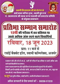 अजमेर 13 जून। स्वामी हिरदाराम जी के प्रेरणा से सांई बाबा मन्दिर ट्रस्ट एवं पंडित आत्माराम व्यास जन्म शताब्दी वर्ष समारोह समिति के संयुक्त तत्वाधान राजस्थान बोर्ड और सी.बी.एस.ई. 12वीं परीक्षा में 80 प्रतिशत या उससे अधिक अंक लाने वाले विद्यार्थियों का सम्मान किया जायेगा।
