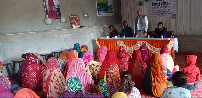 केसरपुरा महिलाओं के लिए सिलाई पर उद्यम विकास कार्यक्रम एलईडीपी आज से ग्राम केसरपुरा में प्रारंभ किया गया नाबार्ड व अर्यमा सेवा समिति के सहयोग से केसरपुरा ग्राम में गठित विभिन्न एसएजी की कुल 30 महिलाओं को सिलाई का प्रशिक्षण प्रदान किया जाएगा मुख्य मुख्य अतिथि नाबार्ड के जिला विकास प्रबंधक विनोद दाधीच ने ग्रामीण लोगों के उत्थान के लिए नाबार्ड की विभिन्न विकासात्मक हस्तक्षेपों के बारे में बताया प्रशिक्षण पश्चात लेकर अपना खुद का स्वरोजगार स्थापित करने की भी संपूर्ण जानकारी उपलब्ध कराई मरुधरा ग्रामीण विकास बैंक के मैनेजर अजय कुमार मीणा ने बताया कि सभी को अपने बैंक में खाता खुलना चाहिए और प्रधानमंत्री जन धन योजना प्रधानमंत्री सुरक्षा बीमा योजना जीवन ज्योति योजना अटल पेंशन योजना की विस्तृत जानकारी दी गई इन योजनाओं में अनहोनी हो जाने पर बैंक द्वारा सहायता मिलती है जिससे परिवारिक को अािर्थक मदद मिलती है महिलाओं को बैंक ऋण में लगाए जाने वाले आवश्यक दस्तावेजों के बारे में बताया जिससे उन्हें ऋण लेने में सुविधा हो सके इसी संदर्भ में अर्यमा सेवा समिति अध्यक्ष बलवंत भाटी ने सभी मुख्य अतिथि को साफा व माला पहनकर स्वागत किया वह अंत में संस्था समन्वयक विजयलक्ष्मी ने बताया कि इस 20 दिवसीय प्रशिक्षण में राजपूती ड्रेस सलवार सूट ब्लाउज आदि में निपुणता प्रदान की जाएगी साथ ही ग्रामीण क्षेत्र में आयसर्जन गतिविधियों के बारे में बहुत गुंजाइश के बारे में बताया और सभी अतिथियों का आभार व्यक्त किया गया