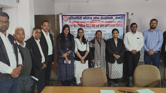 केकड़ी (डॉ.मनोज आहूजा ) यूनिवर्सिटी कॉलेज ऑफ़ होमियोपैथी, केकड़ी के द्वारा बुधवार को कोर्ट परिसर में स्थित अभिभाषक कक्ष में निःशुल्क स्वास्थ्य परिक्षण कर दवाई का वितरण किया गया।इस मौक़े पर अपर जिला न्यायाधीश कुंतल, अपर मुख्य न्यायिक मजिस्ट्रेट रमेश कुमार करोल,अपर मुख्य न्यायिक मजिस्ट्रेट हिरल मीणा,अभियोजन अधिकारी लालचंद कांसोटिया,बार एसोसिएशन के अध्यक्ष राम अवतार मीणा, एडवोकेट नवल किशोर पारीक, एडवोकेट मनोज आहूजा सहित कई अधिवक्ताओं,मुंशी गण सहित स्टांप वेंडर,टाइपिस्ट,न्यायिक कर्मचारियों कर्मचारियों सहित पक्षकारों व उनके परिवार जनों ने स्वास्थ्य परिक्षण करवाते हुए होम्योपेथी चिकित्सा पद्धति को जाना व समझा।वहीं इस मौक़े यूनिवार्सिटी कॉलेज ऑफ़ होम्योपेथी की टीम ने न्यायिक परिवार के सदस्यों के उत्तम स्वास्थ्य के लिए नि:शुल्क परिक्षण कर उचित सलाह दी।इस मौक़े पर न्यायाधीश कुंतल जैन ने कहा कि होम्योपेथी पद्धति के माध्यम से बीमारी की झड़ को समाप्त किया जाता है।उन्होंने चिकित्सा टीम के कार्यों की सराहना भी की।शिविर में शामिल चिकित्सकों की टीम में शिविर चिकित्सा प्रभारी डॉ.अंशुल चाहर,सह आचार्य ऑरगेनन ऑफ़ मेडिसिन विभाग डॉ.कनुप्रिया,सह आचार्य फॉरेंसिक मेडिसिन विभाग डॉ.गौरव गुप्ता एवं कम्पाउण्डर आनंदीलाल, प्रयोगशाला सहायक नौरत बैरवा शामिल थे।जिन्होंने अपनी सराहनीय सेवाएं दी तथा होम्योपेथी पद्धति के सम्बन्ध में विस्तार से जानकारी देते हुए उसका महत्त्व बताया।इस शिविर के माध्यम से कुल 120 जनों का स्वास्थ्य परीक्षण कर उन्हें निःशुल्क दवा का वितरण किया गया,साथ ही उनके बेहतर स्वास्थ्य के लिए चिकित्सकों की टीम ने हेल्थ टिप्स एवं जीवन शैली से संबंधित विकारों से बचने के उपायों के बारे में भी अवगत कराया।शिविर समापन के अवसर पर बार अध्यक्ष रामवतार मीणा,उपाध्यक्ष घनश्याम वैष्णव,पूर्व अध्यक्ष भूपेंद्र सिंह राठौड़,मगन लाल लोधा,हेमंत जैन,नवल किशोर पारीक,डॉ.मनोज आहूजा,गजराज सिंह कानावत सहित अधिवक्ता गण ने सभी चिकित्सकों को उनके समर्पण एवं सेवा भाव के लिए धनयवाद ज्ञापित कर उनका अभिनन्दन किया।इस मौक़े पर महाविद्यालय के प्राचार्य एवं चिकित्सालय अधीक्षक डॉ.पुनीत आर शाह ने सभी चिकित्सकों का उत्साहवर्धन किया।