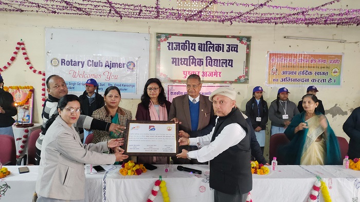 अजमेर 15 जनवरी / राजकीय बालिका उच्च माध्यमिक विद्यालय पुष्कर को बंसल भगवानदास बसंती देवी सोसाइटी (रजि.) अजमेर के अध्यक्ष प्रमुख समाजसेवी एवं भामाशाह हनुमान दयाल बंसल द्वारा रोटरी क्लब अजमेर के सौजन्य व श्री अग्रोहा बंधु पश्चिम क्षेत्र संस्था, अजमेर की प्रेरणा से बालिका शिक्षा के लिये 10 कंप्यूटर व एक प्रिंटर प्रदान किए गए l                                              इस अवसर पर बंसल भगवान दास बसंती देवी सोसाइटी के अध्यक्ष हनुमान दयाल बंसल सचिव प्रमोद मेहता, कोषाध्यक्ष श्रीमती ऊषा बंसल व श्रीमती पुष्पा मेहता, रोटरी क्लब अजमेर से श्रीमती निशा शेखावत, एच डी बंसल, कुलदीप सिंह गहलोत, सुबोध सुरी, विनोद कानूनगो, अनिल धारीवाल व शलभ अग्रवाल तथा श्री अग्रोहा बंधु पश्चिम क्षेत्र संस्थान अजमेर के अध्यक्ष शैलेंद्र अग्रवाल, सचिव अजय अग्रवाल व कोषाध्यक्ष अगम प्रसाद मित्तल, विद्यालय विकास प्रबंधन समिति के सदस्य व नगर परिषद पुष्कर से निवर्तमान पार्षद मुकेश कुमावत, धर्मेंद्र नागोरा व श्रीमती लक्ष्मी देवी पाराशर, विद्यालय प्राचार्य श्रीमती शालू व उप प्राचार्य श्रीमती मनीषा गोयल और अभिभावक उपस्थित रहे l
