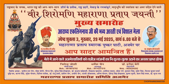 अजमेर। वीरता, स्वाभिमान और मातृभूमि के प्रति अपराजेय निष्ठा के प्रतीक महाराणा प्रताप की जयंती के उपलक्ष्य में महाराणा प्रताप समारोह समिति, अजमेर के तत्वावधान में 29 मई 2025 (गुरुवार) को पुष्कर घाटी स्थित महाराणा प्रताप स्मारक पर सायं 6:00 बजे मुख्य समारोह एवं विशाल मेले का आयोजन किया जाएगा।