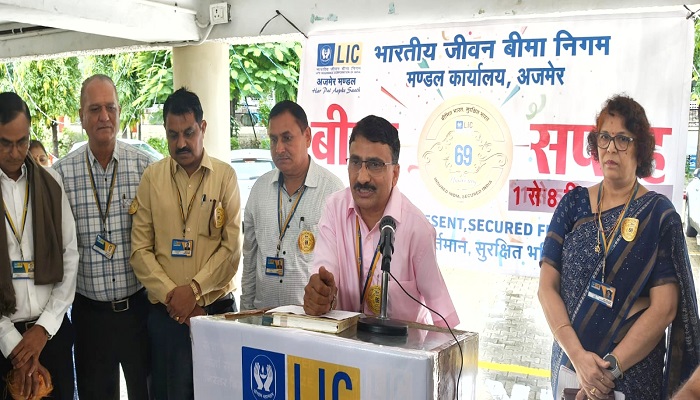 भारतीय जीवन बीमा निगम के 69 वें स्थापना दिवस के अवसर पर मण्डल कार्यालय, अजमेर में दिनांक 01 सितम्बर, 2025 से 08 सितम्बर, 2025 तक बीमा सप्ताह मनाया जाएगा। इसके अन्तर्गत आज निगम के ध्वज का ध्वजारोहण, निगम गीत, दीप प्रज्वलन का कार्यक्रम रखा गया, निगम के वरिष्ठ कार्मिक श्री देवी लाल परमार द्वारा सभी कार्मिकों को निगम के प्रति निष्ठा बनाए रखने की शपथ दिलवाई गई। इस अवसर पर वरिष्ठ मण्डल प्रबन्धक श्री पी.एन. मीना द्वारा अपने उद्बोधन में निगम की उपलब्धियों के बारे में चर्चा करते हुए आने वाले समय में चुनौतियों का सामना बखूबी से करने तथा ग्राहकों को बेहतरीन सेवाएं प्रदान करने का आह्वान किया गया,उन्होंने बताया कि निगम अपनी कार्यशैली में समय के हिसाब से आवश्यक परिवर्तन कर, ग्राहकों की आवश्यकतानुसार नये प्लान लाकर जीवन बीमा क्षेत्र में अपनी श्रेष्ठता तथा अग्रता लगातार बनाए हुए है। ग्राहकों की बंद पड़ी पॉलिसी को पुन शुरू करवाने हेतु निगम द्वारा दिनांक 18 अगस्त से 17 अक्टूबर तक विशेष रिवाइवल अभियान चलाया हुआ है जिसके अंतर्गत ग्राहकों को शुल्क में छूट मिल रही है। निगम द्वारा हाल ही में केंद्रीय सरकार को लाभांश की राशि 7324.34 करोड़ का चैक प्रदान किया गया है।