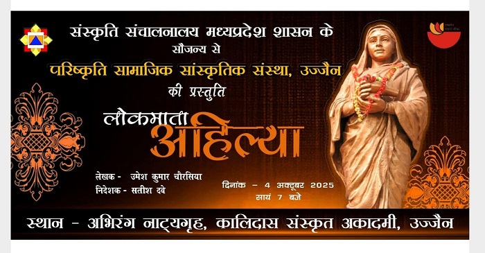 अजमेर/साहित्यकार उमेश कुमार चौरसिया रचित पूर्णांकी नाटक “लोकमाता अहिल्या” का मंचन 4 अक्टूबर को उज्जैन में संस्कृति संचालनालय मध्यप्रदेश शासन के सौजन्य से कालीदास संस्कृत अकादमी के अभिरंग नाट्यगृह में होगा। परिष्कृति सांस्कृतिक संस्था उज्जैन द्वारा प्रख्यात रंगकर्मी सतीश दवे के निर्देशन में हो रही इस नाट्य प्रस्तुति में 40 से अधिक कलाकार अहिल्याबाई के प्रेरक जीवन संघर्ष को जीवंत करेंगे। उल्लेखनीय है कि इससे पूर्व जवाहर कला केंद्र जयपुर सहित भीलवाड़ा, जालौर, दमोह और भोपाल में चौरसिया के इस नाटक की सात प्रस्तुतियां विविध निर्देशकों द्वारा की जा चुकी हैं। इसके नुक्कड़ नाट्य रूपांतर को राजस्थान के 45 स्थानों पर प्रदर्शित किया गया है।