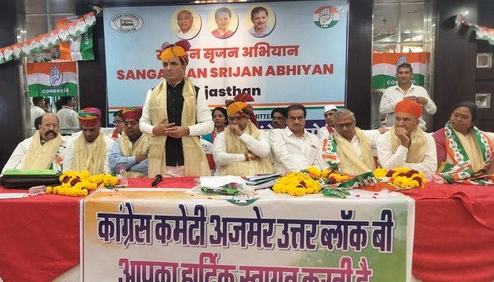 इससे नए लोग पार्टी से जुड़ेंगे। उन्होंने कहा कि कांग्रेस के कार्यकर्ता एक है और एक रहेंगे। साथ ही बैठक को सफल बनाने वाले टीम कार्यकर्ताओं को बधाई दी। इस दौरान वक्ताओं ने कहा कि ऐसा अध्यक्ष बनाए जो आने वाले टाइम में कांग्रेस को लोकसभा, विधानसभा व नगर निगम चुनाव जीता सके । बैठक के दौरान लोकसभा नेता प्रतिपक्ष राहुल गाँधी एआईसीसी अध्यक्ष मल्लिकार्जुन खड़गे, पूर्व मुख्यमंत्री अशोक गहलोत, प्रदेश कांग्रेस अध्यक्ष गोविंद सिंह डोटासरा, एआईसीसी पर्यवेक्षक अशोक तंवर व पूर्व आरटीडीसी अध्यक्ष धर्मेंद्र राठौड़ के समर्थन में जमकर जिंदाबाद के नारे लगाए गए। साथ ही हमारा नेता के कैसा हो, धर्मेंद्र राठौड़ जैसा हो, के नारे भी खूब लगे। बैठक में सैकड़ों कार्यकर्ता शामिल हुए और ताकत दिखाई। संगठन सृजन अभियान की आयोजित बैठक में मंच पर बैठे एआईसीसी पर्यवेक्षक मुख्य अतिथि अशोक तंवर, पीसीसी उपाध्यक्ष व पर्यवेक्षक रमेश खंडेलवाल, ललित बोरीवाल, बोरीवाल, पूर्व आरटीडीसी अध्यक्ष धर्मेंद्र राठौड़, प्रदेश उपाध्यक्ष पूर्व विधायक डॉक्टर राजुकमार जयपाल, डेयरी अध्यक्ष रामचंद्र चौधरी, पूर्व विधायक डाक्टर श्रीगोपाल बाहेती, वरिष्ठ नेता राजेश टंडन, नगर निगम नेता प्रतिपक्ष द्रौपदी कोली, प्रदेश कांग्रेस सचिव कैलाश झालीवाल, शहर महासचिव पार्षद नोरत गुर्जर, ब्लॉक कांग्रेस अध्यक्ष शैलेन्द्र अग्रवाल व वाहिद मोहम्मद आदि ने संबोधित किया और अभियान को सफल बनाने की बात कही। बैठक का संचालन ब्लॉक कांग्रेस अध्यक्ष शैलेंद्र अग्रवाल ने किया, कार्यक्रम का शुभारंभ वन्दे मातरम गान के साथ हुआ तत्पश्चात ब्लॉक अध्यक्ष शैलेंद्र अग्रवाल ने मुख्य अतिथि श्री अशोक तंवर सहित सभी अतिथियों का दुपट्टा पहनाकर व माल्यार्पण कर स्वागत किया l