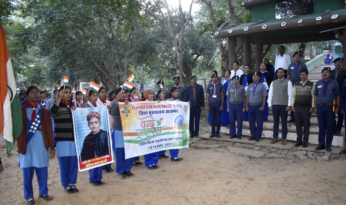 अजमेर, 7 नवंबर। वंदे मातरम्@150 के विविध कार्यक्रमों के आयोजन की श्रृंखला में शुक्रवार को जिला स्तरीय प्रभात फेरी का आयोजन किया गया। इसे अतिरिक्त जिला कलक्टर श्री नरेन्द्र कुमार मीणा द्वारा हरी झण्डी दिखाकर रवाना किया गया। प्रभात फेरी स्काउट प्रशिक्षण केन्द्र पुष्कर घाटी से आरम्भ हुई। इसका समापन लीला सेवडी गांव में हुआ। इसमें 350 से अधिक स्काउटस एवं गाईडस ने भाग लिया।
