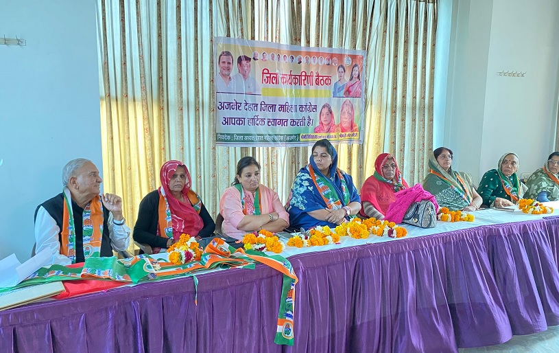 सभी ब्लॉक अध्यक्षों में श्रीनगर ब्लॉक अध्यक्ष श्रीमती लक्ष्मी देवी, भिनाय ब्लॉक अध्यक्ष श्रीमती सरोज कंबर, सरवाड़ ब्लॉक अध्यक्ष श्रीमती धीरज खिंची, पीसांगन ब्लॉक अध्यक्ष श्रीमती लाजवती डांगी, केकड़ी ब्लॉक अध्यक्ष श्रीमती रिया चौधरी पुष्कर नगर अध्यक्ष श्रीमती चेतना कुमावत का श्रीमती सीमा चौधरी वरिष्ठ कांग्रेस कार्यकर्ता द्वारा माला पहनाकर स्वागत किया गया व अतिथियों तथा उपस्थित सभी महिलाओं का हार्दिक स्वागत किया गया। कार्यक्रम का संचालन श्रीमती लाजवंती ने अत्यंत गरिमामय व प्रभावी ढंग से किया।महिलाओं को जोड़ने पर विशेष फोकस बैठक में यह विचार गूंजता रहा कि महिलाओं की भागीदारी के बिना कांग्रेस संगठन कभी मजबूत नहीं हो सकता। महिला कांग्रेस ने संकल्प लिया कि कोई भी महिला पीछे न रहे- हर गाँव, हर वार्ड और हर बूथ पर महिला की आवाज बुलंद होगी।”