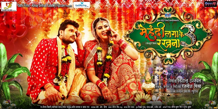 यशी फिल्‍म्‍स, अभय सिन्‍हा और ईज माय ट्रिप डॉट कॉम प्रस्‍तुत और रेणु विजय फिल्‍म्‍स इंटरटेंमेंट बैनर तले बन रही ‘मेहंदी लगाके रखना 3’ में खेसारीलाल यादव और शहर अफसा के अलावा एक बार फिर ऋतु सिंह नजर आयेंगी। तो एक गाने में यूट्यूब क्‍वीन आम्रपाली दुबे का भी दमदार एपीयरेंस होगा। फिल्‍म में श्रद्धा नवल, मनोज सिंह टाइगर, बृजेश त्रिपाठी, रोहित सिंह मटरू, नीलकमल, महेश आचार्य, अमित शुक्‍ला, निशा झा, महनाज श्राफ, सूर्या द्विवेदी और उदय तिवारी मुख्‍य भूमिका में होंगे। प्रोजेक्‍ट डिजाइनर अनंजय रघुराज और पीआरओ रंजन सिन्‍हा हैं। गीत विनय बिहारी, प्‍यारेलाल यादव, मनोज भावुक, अजीत हलचल और यादव राजा का होगा। छायांकन आर आर प्रिंस, एक्‍शन हीरा यादव, कोरियोग्राफी रिकी गुप्‍ता, संजय कोर्वे, संजीव शर्मा और कार्यकारी निर्माता अनिल कुमार सिंह व सुरेंद्र कुमार हैं।