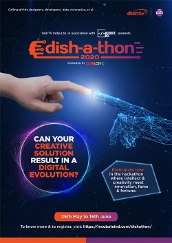Dish-a-thon 2020 is open for individual team of developers and startups. DishTV along with IncubateIND will be shortlisting 40 teams for a 48-hour open-format grand finale, which will be a combination of virtual event between 12-14 June 2020. During the event, participants will get an opportunity to interact with industry experts and work with mentors to co-create and co-develop new solution and technology. The winners will be recognized through certifications and cash rewards and will also stand a chance to start a strategic engagement with DishTV.