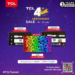 नई दिल्ली, जुलाई, 16, 2020: विश्व की दूसरी सबसे बड़ी टीवी कॉर्पोरेशन टीसीएल चौथी एनिवर्सरी के उपलक्ष में भारत में सेल आयोजित कर रही है। टीसीएल इस साल 39 वर्ष की हो जाएगी और यह ब्रैंड एलईडी टीवी मार्केट शेयर के मामले में अमेरिका में दूसरे स्थान पर है। हाल ही में इसने तिरुपति में स्वयं की पहली पैनल फैक्टरी का संचालन शरू किया है। कंपनी का लक्ष्य मेक इन इंडिया के अंतर्गत ब्रैंड की सबसे बड़ी ओवरसीज फैक्टरी बनाना है।