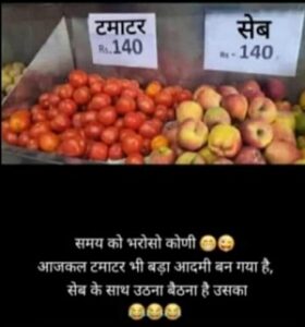 एक और मीम को देखकर हँसी ही छूट गई.. लौकी, भिंडी और आलू को देखकर जब टमाटर कहता है, हटो! मैं बच्चों से बात नहीं करता। जब और खँगाला, तो देखा कि सोशल मीडिया टमाटर की तरह ही लाल रंग में रंगा हुआ है। “टमाटर को राष्ट्रीय सब्जी घोषित कर देना चाहिए”, “गरीबी का पाठ किसी और को ही पढ़ाना, मैंने कल ही तुम्हें सलाद में टमाटर खाते देखा है”, “महँगे इतने हो जाओ कि लोग कहें भाईसाहब ये किस लाइन में आ गए आप?”, “चाँद पर है अपुन” “अब प्याज नहीं, टमाटर रुला रहे हैं..”, “पेट्रोल-डीजल भी पीछे छूट गए रे बाबा”, “कुछ दिनों में सुनार की दुकान पर बिकेगा टमाटर”, “अभी भी नहीं आ रही है न! कुछ दिनों में 20 रुपए का एक मिलेगा, तब समझ आएगी टमाटर की कीमत..”, “टमाटर में पैसे लगा दो! क्रिप्टो करंसी का भविष्य क्या है, यह तो नहीं पता। लेकिन टमाटर खूब आगे जाएगा!” और भी बहुत से चटखारे सोशल मीडिया पर भरे पड़े हैं।