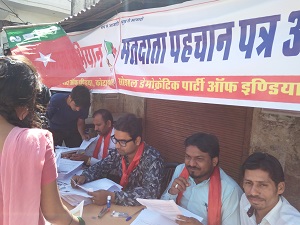 कोटा 05 मार्च 2017 सोशल डेमोक्रेटिक पार्टी आॅफ इण्डिया की कोटा की लाडपुरा विधानसभा इकाई की ओर से राज्य निर्वाचन विभाग के जिला स्तर पर युवा मतदाताओं के पहचान पत्र अभियान के तहत आज दिनांक 05 मार्च को वार्ड नम्बर 63 कोटडी फकीरो की मस्जिद के पास मतदाता पहचान पत्र में नाम जुडवाने के लिए कैम्प लगाया जिसमें सैकड़ों नवयुवक युवतियों के फॉर्म भरे गये। इस मौके पर जिलाध्यक्ष जफर चिश्ती, पॉपुलर फ्रंट जिलाध्यक्ष शोएब अहमद, जिला उपाध्यक्ष इमरान बाबा, जिला सचिव राजा वारसी ने पहुंचकर व्यवस्थाओं को देखा। कोटा जिला सदस्य डाॅ. साजिद हुसैन, लाडपुरा विधानसभा के महासचिव इमरान, सचिव जीशान सहित इरशाद खान, पप्पू भाई, मोहसिन भाई सहित कई कार्यकर्ताओं ने सभी के फार्म भरें। जिला महासचिव नावेद अख्तर ने बताया कि पार्टी की और से 14 मार्च तक शहर के विभिन्न इलाकों में अलग अलग जगहों पर कैम्प लगाकर 1 जनवरी 2017 को अठारह वर्ष पूर्ण करने वाले सभी नवयुवक व युवतियों के मतदाता पहचान पत्र बनवाए जाऐंगें।