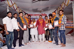 बाराँ 9 अगस्त। जिला रक्तदान समूह के स्थापना दिवस के उपलक्ष में बुधवार को कोटा रोड स्थित सौगाग श्री मेरिज गार्डन में विषाल रक्तदान षिविर एवं रक्तदाता सम्मान समारोह आयोजित किया गया। कोटा रोड स्थित सौगाग श्रीमेरिज गार्डन में आयोजित किया गया। समारोह में मुख्य अतिथि जिला प्रमुख नंदलाल सुमन थे। जिन्होंनेे रक्तदान के महत्व पर प्रकाष डाला। साथ ही कहा इससे किसी का जीवन बचाया जा सकता है। इससे बडा कोई पुण्य नहीं होता है। वे स्वयं भी अपने पौत्र के जन्मदिन पर पिछले आठ साल से रक्तदान षिविर आयोजित करते आ रहे हैं। विषिश्ट अतिथि जिला रक्तदान समूह के अध्यक्ष नीरज सुमन व हिम्मत सिंह हाड़ा थे। अध्यक्षता भूपेंद्र पंकज ने की। इस अवसर रक्तदाताओं को सम्मनित किया गया। इनमेें प्रषंसा पत्र व 57 को प्रतीक चिन्ह देकर सम्मानित किया गया। इनमें अवधेष षर्मा, जयपुर से नेहा षर्मा, दीपक डीडवाल, नेहा, गौरव चैहान, प्रतापगढ से मनीश मेघवाल, संजय बुनकर, विक्की करौलिया, कन्हैया सुमन, मांडलगढ़ कोटा से चंदू पांचाल, अनिला प्रजापति, जीतू, अमनदीप सिंह, तरूण, कोटा से ष्याम दोहड़िया, मदन बंजारा, राजेष पंकज, रूपचंद पंकज बोरदा, केषरीलाल दतेरिया, नरेंद्र पंकज, सुरेष आदि षामिल थे।