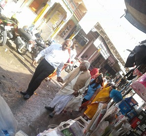मुख्य मार्ग पर कीचड़ होने के कारण सेठ कैलाशचंद्र जैन का हाथ पकड़कर ले जाते उनके पुत्र