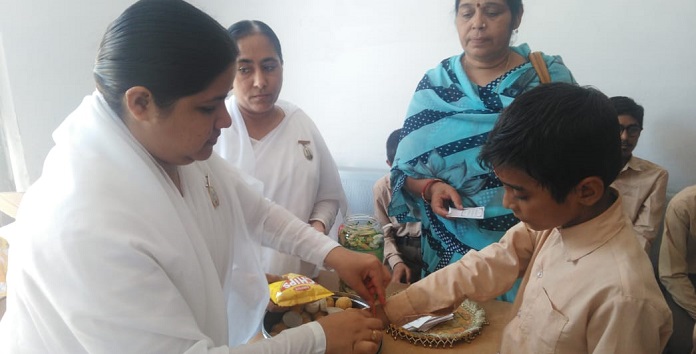 बीकानेर, 20 अगस्त। प्रजापिता ब्रह्माकुमारी ईश्वरीय विश्व विद्यालय के क्षेत्रीय केन्द्र सार्दुल गंज की ओर से आयोजित सात दिवसीय रक्षाबंधन पर्व के तहत सोमवार को नेत्रहीन व मूक बधिर विद्यालय में विद्यार्थियों के भाल पर कुंमकुंम से तिलक लगाया तथा मुंह मीठा करवाकर कलाई पर रेश्मी धागों से गूंथी आध्यात्मिक संदेश देने वाली राखी बांधी। विद्यार्थी राखी को कलाई पर बांधने पर प्रसन्न हुए तथा मन के प्रसन्न भावों से ब्रह्माकुमारी बहनों के प्रति आत्मीय स्नेह के साथ आभार जताया।