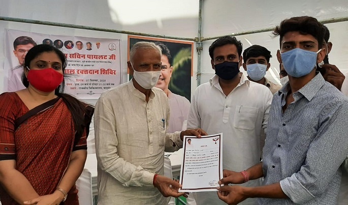 राजस्थान प्रदेश कांग्रेस कमेटी के पूर्व अध्यक्ष एवं राज्य के पूर्व उप मुख्यमंत्री सचिन पायलट के जन्मदिन पर जिला मुख्यालय स्थित राजकीय चिकित्सालय में रक्तदान कार्यक्रम आयोजित हुआ। युवा नेता आज़ाद सिंह राठौड़ ने बताया कि कोविड संक्रमण की पूर्ण सतर्कता व गाइडलाइन की पालना में आयोजित रक्तदान शिविर में जिलेभर से आए कार्यकर्ताओं सहित महिला कार्यकर्ताओं द्वारा हर्षोहुल्लास एवं बढ़चढ़ कर 235 यूनिट रिकॉर्ड रक्तदान से अस्पताल में भंडारण भरने से आयोजन समिति ने रक्तदान से वंचित रहें 305 कार्यकर्ताओं का पंजीयन कर अस्पताल प्रशासन को सौपी उनकी सूची।